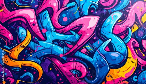 Vibrant abstract graffiti art. Pink, blue, yellow, purple swirls and patterns. Bold, energetic, creative design. Ideal for backgrounds or prints.
