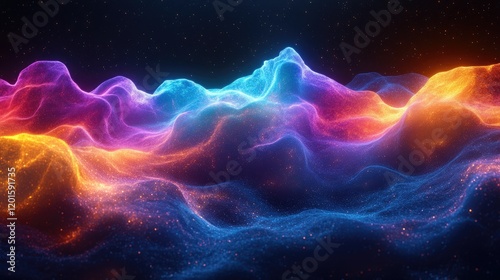Vibrant abstract landscape of glowing waves in neon colors, set against a starry night background