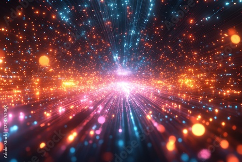 Vibrant Abstract Light Burst with Dynamic Orange and Blue Glowing Particles in Motion