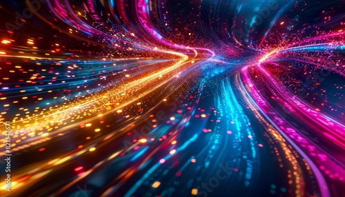 Vibrant, abstract light trails in motion, showcasing a blend of blue, pink, and yellow hues creating a dynamic visual experience.
