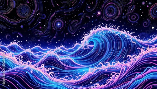 Vibrant Abstract Ocean Waves with Neon Colors and Cosmic Background in Artistic Digital Illustration