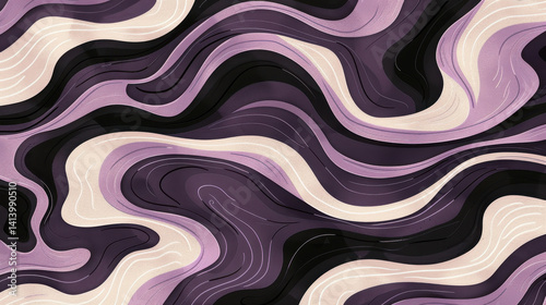 vibrant abstract pattern featuring flowing waves in shades of purple, black, and cream, creating dynamic and modern design. smooth curves evoke sense of movement and creativity