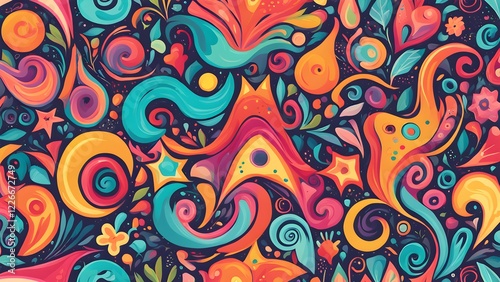 Vibrant abstract seamless pattern with swirling shapes, flowers, and stars in a bold color palette.