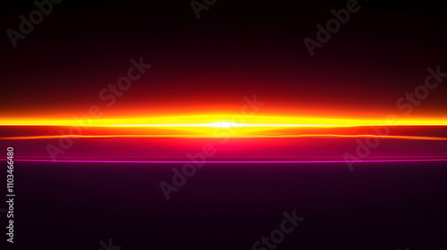 Vibrant abstract sunset or sunrise with intense orange, yellow, and magenta hues. A horizontal band of light dominates against a dark background, creating a striking and dynamic image.