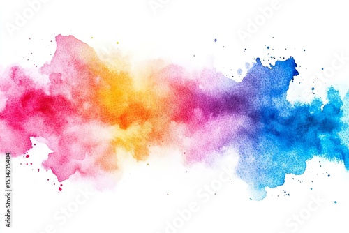 Vibrant abstract watercolor splash in rainbow colors on a white background. Artistic paint texture with gradient blend of blue, pink, orange and yellow tones. High-resolution isolated ink blot for cre