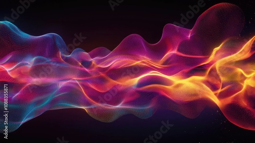 Vibrant Abstract Waveform of Particles in Dynamic Patterns, Showcasing Futuristic Technology and Flowing Energy in a Multi-Colored Spectrum, Digital Design.