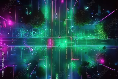 Vibrant Aerial View of Urban Intersection Illuminated with Neon Lights, Showcasing Futuristic Cityscape and Dynamic Traffic Patterns at Night
