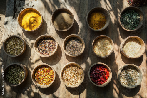 Vibrant and aromatic display of spices and herbs presented in wooden bowls, capturing the essence of culinary tradition