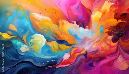 Vibrant and Colorful Abstract Painting Showcasing Mixed Paint Fluids Creating a Striking Backdrop