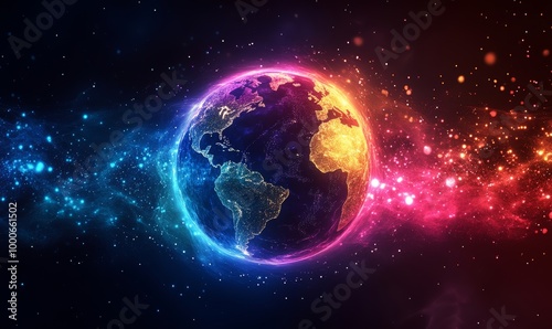 Vibrant and colorful illustration of the Earth with a glowing, neon-like effect, symbolizing global connectivity, digital innovation, and creative representation of, Generative AI