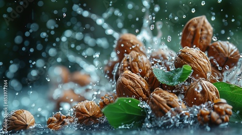 Vibrant and crisp image of fresh walnuts amidst splashing water and green leaves for a refreshing concept