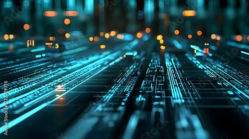 Vibrant and dynamic 3D depicting a hybrid and innovative energy system with interconnected green and blue power lines representing a futuristic and technologically advanced digital network or grid