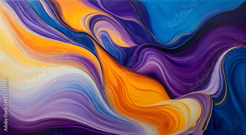 Vibrant and dynamic abstract art piece. The canvas is filled with swirling patterns in hues of blue, purple, yellow, and orange of colorful painting style wavy background