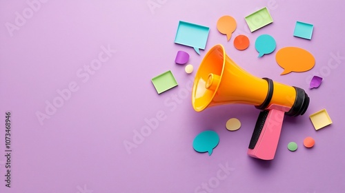 Vibrant and Dynamic Megaphone with Swirling Speech Bubbles on a Rich Purple Background Symbolizing the Power of Effective Communication Marketing and Outreach