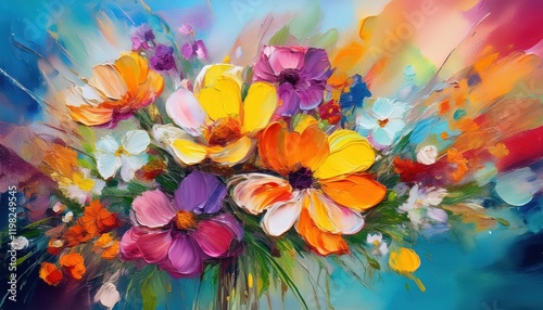 Vibrant and Expressive Abstract Bouquet of Spring Flowers in a Splash of Colors, Showcasing the Essence of Natures Blossoms through Artistic Watercolor Techniques.