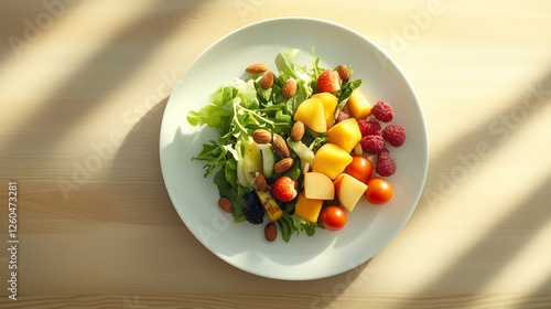 Vibrant and healthy meal on a beautifully arranged plate featuring a colorful salad with fresh greens, fruits, and nuts, with the message 'Eat Healthy in 2024' subtly included.