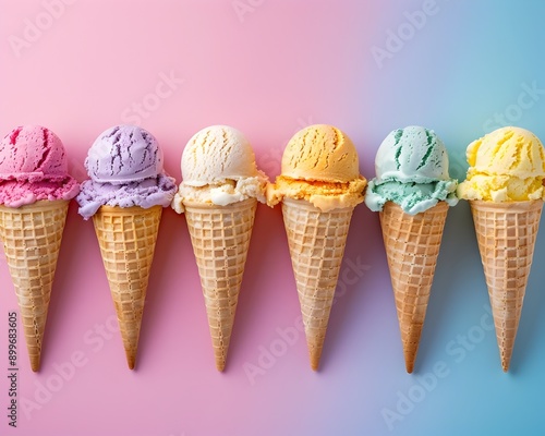 Vibrant and Playful Arrangement of Colorful Ice Cream Cones with Diverse Flavors Against a Bright Background