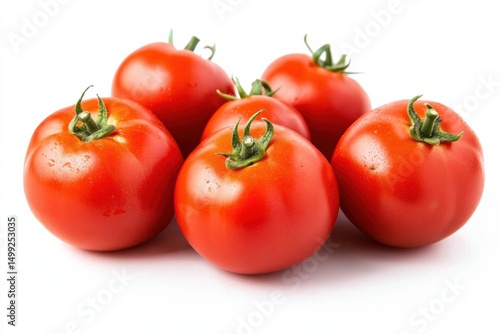 Vibrant arrangement of six fresh and ripe red tomatoes on a white background, various sizes and shapes, shiny and colorful