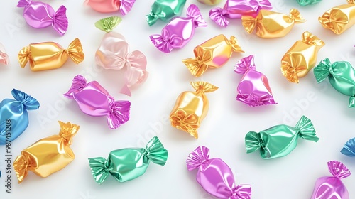 Vibrant assortment of foil wrapped candies scattered on a clean white background in a flat design style This 3D rendered image showcases the glossy