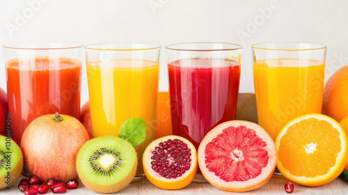 Vibrant assortment of fresh fruit juices and sliced fruits for a refreshing summer beverage display