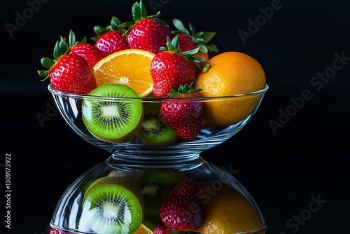 Vibrant assortment of fresh fruits in glass bowl with reflective surface - strawberries, oranges, and kiwis on black background