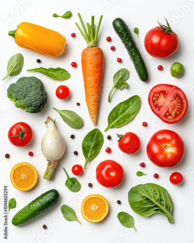 Vibrant assortment of fresh vegetables and fruits arranged artistically on a white background, ideal for health and nutrition themes.