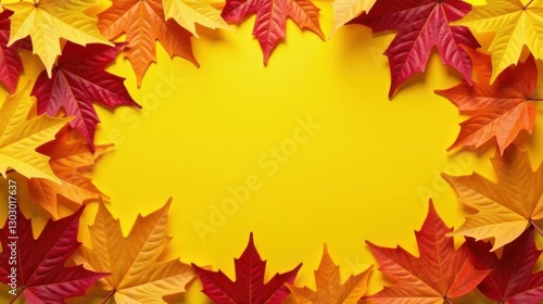 Vibrant Autumn Foliage Arranged in a Festive Border on a Sunny Yellow Background, Perfect for Seasonal Designs and Fall Themed Projects