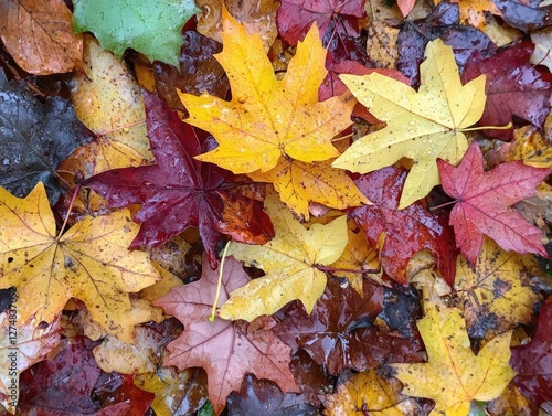Vibrant Autumn Forest Floor with Colorful Maple and Oak Leaves in Morning Sunlight