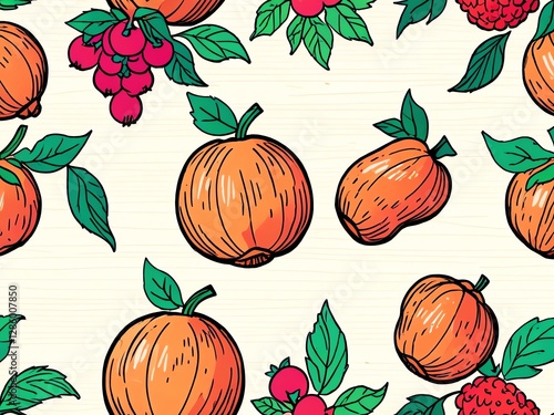 Vibrant Autumn Harvest: A Delightful Pattern of Apples, Berries, and Raspberries