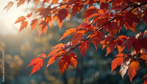 Vibrant autumn leaves ablaze with warm hues, illuminated by the soft sunlight filtering through the branches.