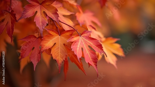 Vibrant Autumn Leaves Close-up, Red, Orange, and Gold Maple Foliage Against a Blurred Coral Background