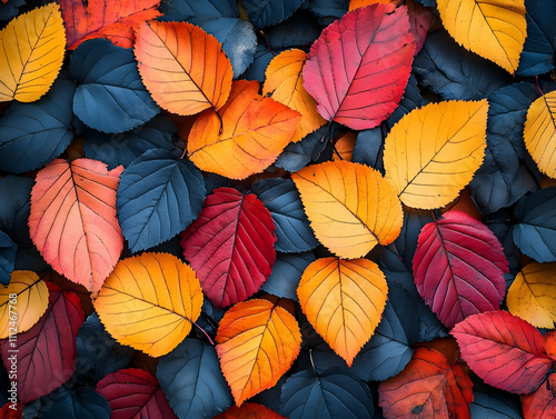 Vibrant autumn leaves in shades of red, orange, and yellow scattered on smooth black stones, creating a vivid seasonal texture