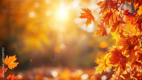 Vibrant autumn maple leaves illuminated by golden sunlight, creating a warm and cozy natural autumn background