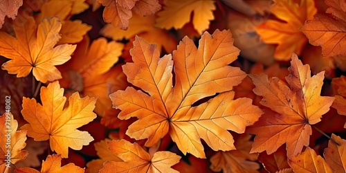 Vibrant autumnal display orange and yellow leaves creating seasonal tapestry. Fall beauty captured in intricate patterns of maple foliage against bright backdrop. Nature final flourish before winter