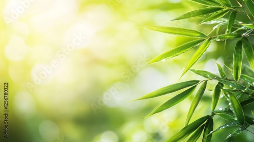 Vibrant bamboo leaf with dewdrops, soft sunlight, blurred flowers, embodying summer's refreshing simplicity.