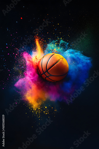 Vibrant basketball emerging from a colorful explosion of paint, showcasing dynamic motion and energy