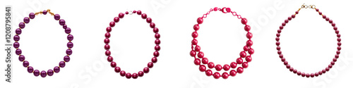 Vibrant beaded necklaces in warm burgundy red and pink shades laid on a plain background The necklaces feature various shapes sizes and textures of beads