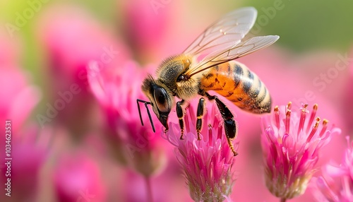 Vibrant bee on a pink flower in a blooming nature garden, collecting pollen at a sunny meadow, stunning colors highlighted in a closeup macro image for World Bee Day