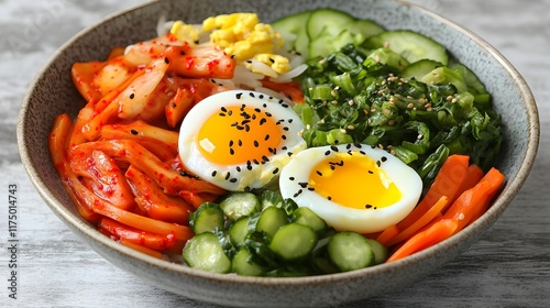 Vibrant Bibimbap bowl with kimchi, vegetables, and soft boiled eggs.