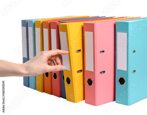 Vibrant binders are neatly arranged in a row, with a hand reaching for one, illustrating efficient document management.