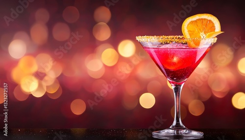 Vibrant blood orange and ginger tequila sour, flamed with a floating orange peel garnish, set against a deep burgundy and gold bokeh bar backdrop.