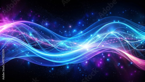 Vibrant blue and purple undulating light waves ripple through a dark background, evoking a sense of dynamic energy and mesmerizing cosmic movement.