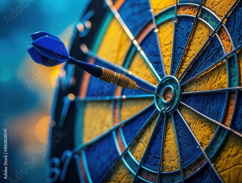 vibrant blue and yellow dartboard with a dart precisely hitting the bullseye dynamic composition with motion blur suggests accuracy and business success