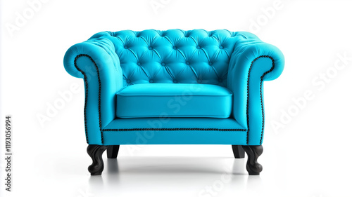 vibrant blue armchair with tufted upholstery and dark wooden legs, showcasing classic design against white background. chair exudes elegance and comfort