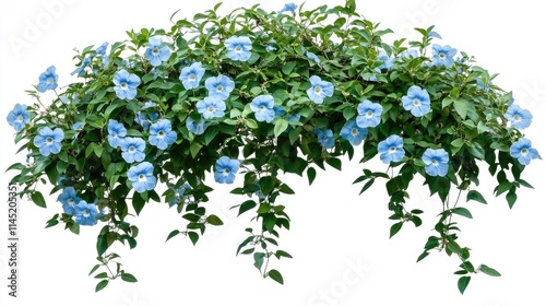 Vibrant Blue Flowers Cascading from Green Leaves on a White Background