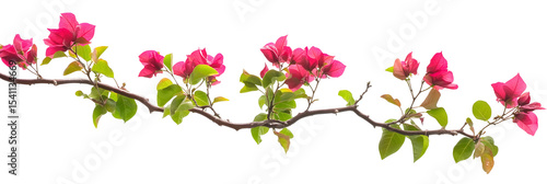 Vibrant bougainvillea branch with pink blossoms and green leaves against a stark black backdrop