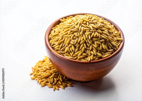 Vibrant Bowl of Dried Paddy Seeds on a Clean White Background, Perfect for Agricultural and Culinary Themes with Ample Copy Space for Text or Branding Needs