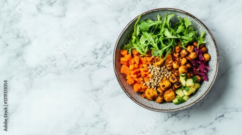 Vibrant Buddha Bowl: A visually appealing and healthy Buddha bowl featuring a colorful array of fresh ingredients arranged artfully on a marbled surface.