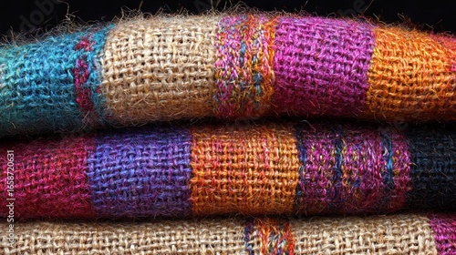 Vibrant Burlap Textile Stack: A Close-Up of Colorful Woven Fabric