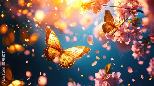 Vibrant Butterflies Amidst Cherry Blossoms with Soft Bokeh Effect